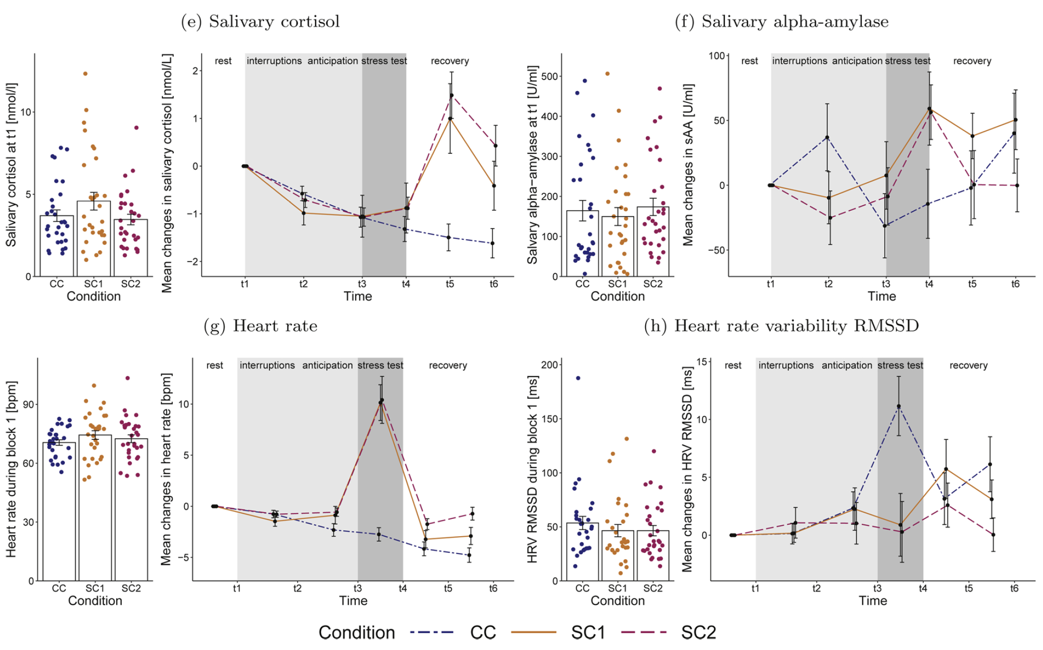 Methods and materials: Ninety participants (44 female; mean age 23.11 ± 3.80) were randomly assigned to either a control condition or one of two experimental conditions in which they were exposed to psychosocial stress with or without prior work interruptions in a realistic multi-participant laboratory setting. To induce psychosocial stress, we adapted the Trier Social Stress Test for Groups to an office environment. Throughout the experiment, we continuously monitored heart rate and heart rate variability. Participants repeatedly reported on their current mood, calmness, wakefulness and perceived stress and gave saliva samples to assess changes in salivary cortisol and salivary alpha-amylase. Additionally, cognitive appraisal of the psychosocial stress test was evaluated.